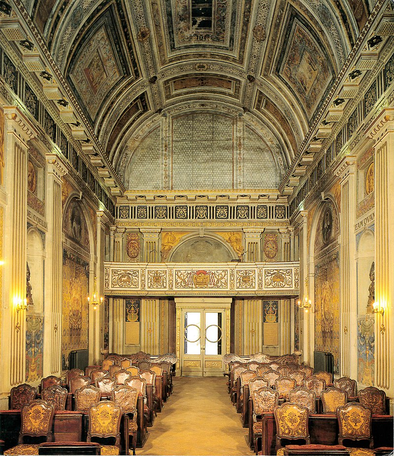 Ora, saliti gli ampi scaloni alla loggia superiore, entriamo nella vasta sala. Già compiuta nel 1583, adorna di vivaci affreschi , illustranti, per volere di Federigo, le principali gesta del fondatore del collegio. Pochi cenni su questi affreschi, da noi descritti altrove. Essi furono eseguiti da Cesare Nebbia D’ Orvieto e da Federico Zuccari di S. Angelo in Vado: al primo spetta tutta la dipintura della volta , di magnifico effetto decorativo, e il gran quadro della parete minore, che ritrae la peste di Milano; al secondo il quadro dell’altra parete minore. Coloritore più vivace il Nebbia, più corretto disegnatore lo Zuccari; tutti e due grandissimi compositori. Il Nebbia , invitato da Federigo Borromeo, che lo aveva conosciuto a Roma, venne a iniziare i lavori nell’ aprile del 1603, e il 3 luglio 1604 ebbe il saldo di tutta la decorazione della volta, la quale, oltre che di motivi decorativi e di figure allegoriche, è adorna di cinque quadri, rappresentanti la traslazione fatta da San Carlo di reliquie di santi, la visita di San Carlo al santuario di Varallo, la fondazione di alcuni collegi istituiti dal santo, l’accoglienza fatta a san Carlo dai duchi di Savoja, le esequie del santo. Avendo il Nebbia chiesto al cardinale il permesso di interrompere il lavoro per tornare in patria, il cardinale si rivolse allo Zuccari, il cui nome, dopo il marzo 1604, appare nei registri del Collegio sempre unito a quello del Nebbia per i dipinti nel salone. Mentre il Nebbia lavorava all’affresco rappresentante la peste di San Carlo, lo Zuccari dava opera al quadro di riscontro, rappresentante l'imposizione del cappello cardinalizio a san Carlo e i due quadri furono finiti nell’ottobre 1604. Il quadro dello Zuccari è dunque una delle ultime opere di quel ferocissimo e ancor vigoroso ingegno (1609). Disgraziatamente rimasero ignude le pareti maggiori.