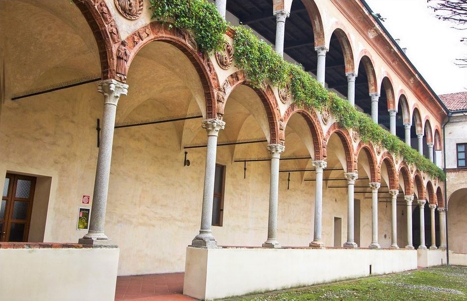 Il vasto cortile è circondato da un portico adorno negli archi di terrecotte eseguite su modelli dell’Amadeo, e di affreschi di Bernardino de Rossi alle pareti. Le snelle colonne, le arcate slanciate e ariose più di quelle della Certosa , le mezze figure di monaci preganti, i morbidi angioletti svolazzanti fanno di questo chiostro una delle più deliziose opere del rinascimento pavese. Quanto agli affreschi, assai ben conservato è quello del lato di mezzodì, firmato e datato (1491), corretto di forme e vivace di colorito rappresentante la Vergine col Bambino, san Benedetto e i committenti. Ne riferiamo l’iscrizione, che va deperendo, perché si ricordi: Hoc opus fecit Antonius de Puteo de anno MCCCCLXXXXXI Bernardinus de Rubeis pinxit.